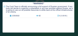 2022/02/25 CyberScoop — ロシア情報機関とのつながりを疑われ、医療機関などの多数の標的を攻撃することで知られる、悪名高いランサムウェア Conti は、金曜日に「ロシア政府を全面的に支持することを公式に発表する」という警告を掲載した。