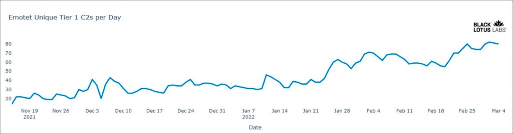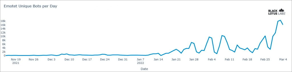 Black Lotus labs の脅威アナリストたちは、Emotet の Epoch 3 をさらに深く掘り下げ、新機能を特定し、現在の配布パターンをマッピングすることにした。以下に示すように、Emotet ボットネットは 2021年11月にゆっくりと自己再生し始め、2022年1月からのフィッシング・キャンペーンを通じて、はるかに多くの配布が見られるようになった。