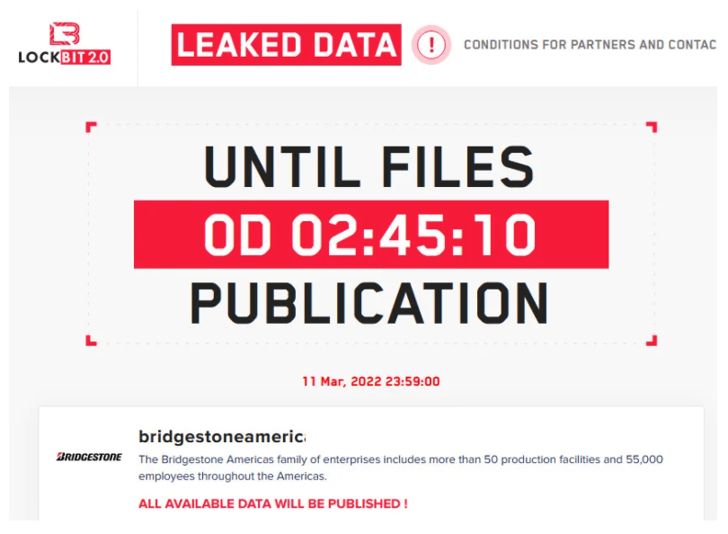 2022/03/11 BleepingComputer — 世界最大級のタイヤメーカーである Bridgestone Americas が、ランサムウェア・グループ LockBit によるサイバー攻撃を受けたと発表した。脅威アクターは、同社から盗んだ全データを流出させると発表し、その時点で3時間を切っている、カウントダウン・タイマーを起動した。2020年末の資料によると、Bridgestone は、世界に数十の生産拠点と 13万人以上の従業員 (正社員、契約社員) を擁する企業である。
