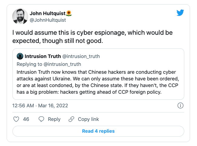 また、TAG の Head である Shane Huntley は、Leonard による評価を確認した後に、「ウクライナ戦争に関心を持っているのは、ヨーロッパの脅威アクターだけではない。ここでも、中国は懸命に動いている」と述べている。その点は、中国からと疑われるハッキング操作を暴露する、秘密グループ Intrusion Truth の主張と一致している。火曜日に Intrusion Truth は、おそらく中国政府の要請により、ウクライナを標的としている、中国の脅威アクターの動きを認識していると述べている。