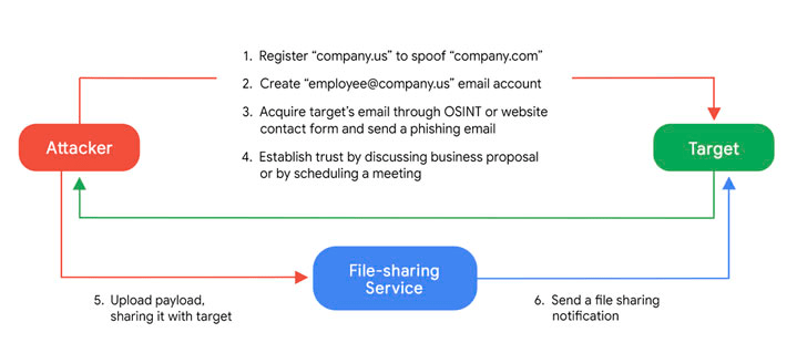 ソーシャル・エンジニアリングの一部として、成りすましメール・アカウントから送信される脅威アクターからの誘いは、特に IT/サイバー・セキュリティ/ヘルスケア分野を対象としていたが、2021年11月以降は多様な業界や組織を対象とする、無差別な攻撃へと発展している。