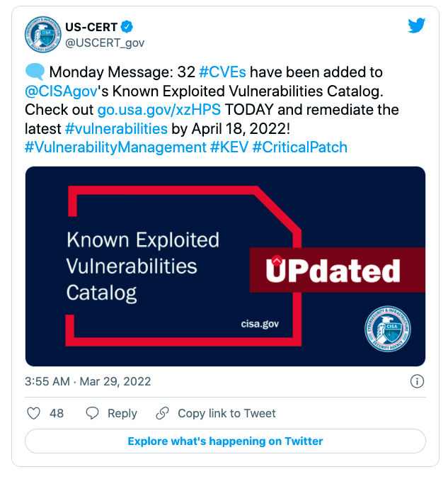 2021年11月に発行された拘束力のある運用指令 (BOD 22-01) によると、連邦政府民間行政機関 (FCEB) は、これらの脆弱性に対してシステムを保護する必要があり、CISA は 4月18日までにパッチを適用するよう求めている。CISA は、「この種の脆弱性は、あらゆる種類の悪意のサイバー行為者が、頻繁に攻撃に使用するベクターであり、連邦政府の企業にとって深刻なリスクとなる」と説明している。