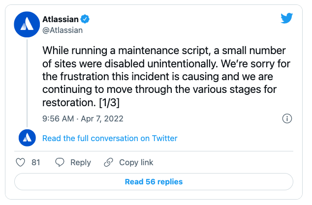 同社製品を使用している企業への影響は否定できないが、Atlassian によると、20万以上の顧客のうち、影響を受けているのは約 400社に過ぎないという。この長期間の停止について、BleepingComputer が最初に報告したとき、定期メンテナンスのスクリプトが意図せずに少数のサイトを無効にし、顧客の製品やデータへのアクセスをブロックしてしまった、と Atlassian は述べていた。