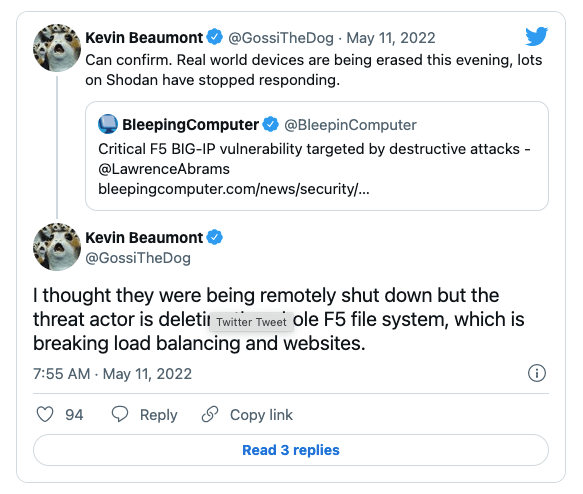 その数日後には、セキュリティ研究者たちが Twitter/GitHub で共有したエクスプロイトを、脅威アクターたちが使用し始めた。これらの攻撃者の大半は、侵入したネットワークに Web シェルをドロップするだけだったが、SANS Internet Storm Center とセキュリティ研究者の Kevin Beaumont は、脅威アクター が “rm -rf /*” コマンドを実行して、BIG-IP デバイスの Linux ファイル・システムを消去できることを発見している。