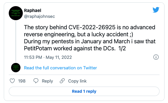 Raphael John は BleepingComputer との会話において、「私は報告書の中で、これは PetitPotam だけを示し、新たに発見/変更されたものはないことを明確にした。PetitPotam が、Microsoft の修正後も生き続けたのは、2021年8月のセキュリティ・アップデートでも Topotam バイパスが止まらず、2022年1月に自分のツールに追加したためだ」と述べている。