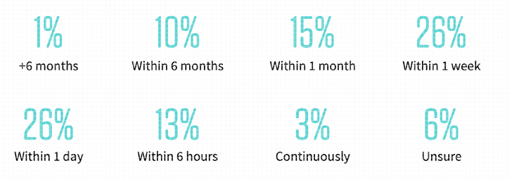 SaaS のセキュリティを手動で監視している組織の 46% は、チェックを月に1 回以下しか行わず、5% はチェックを全く行っていない。ミス・コンフィグレーションを発見した後に、それを解決するセキュリティ・チームはさらなる時間を消費する。約4社に1社は、手動でミス・コンフィグレーションを修正する場合に、1週間以上の時間を消費する。このような状況に陥る組織は、長時間の脆弱な状態を引きずることになる。