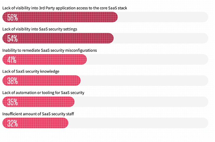 こうした SaaS のミス・コンフィグレーションの原因は一体何なのだろうか。いくつかの要因が考えられるが、アンケートの回答者たちは、SaaS のセキュリティ設定にアクセスできる部署が多すぎること (35%) 、SaaS のセキュリティ設定の変更を可視化できないこと (34%) という、3つの主要原因に絞り込んでいる。この2つは関連する問題であり、SaaS を採用する際に、可視性の欠如が最大の懸念事項として挙げられていることや、セキュリティ設定にアクセスできる複数の部署を、一般的な組織が抱えていることを考えると、どちらも驚くべきことではない。言い換えるなら、セキュリティ設定にアクセスできる部門が多すぎ、また、それらの部門の多くが適切なセキュリティ・トレーニングを受けていないことが、可視性の欠如の主な理由となる。