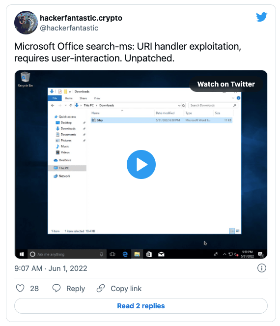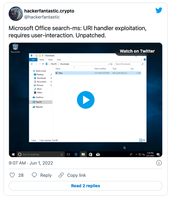 2022/06/01 BleepingComputer — Windows Search で見つかった新たなゼロデイ脆弱性は、Word 文書を起動するだけで、リモートにホストされているマルウェア実行ファイルを取り込んだかたちで、検索ウィンドウを自動的に開いてしまうとされる。このセキュリティ上の問題は、Windows が search-ms と呼ばれる URI プロトコル・ハンドラをサポートしているため、アプリケーションと HTML リンクを組み合わたせた、悪意の検索にも利用されてしまう。