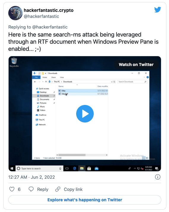 MSDT の悪用と同様に、Explorer のプレビュー・ペインに文書が表示されると、自動的に Windows Search ウィンドウを開く RTF バージョンを作成できることも、Matthew Hickey は示している。