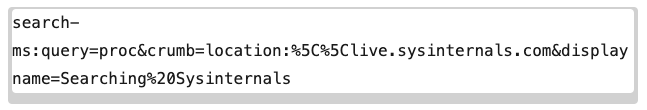 ほとんどの Windows 検索はローカル・デバイスのインデックスを検索するが、このケースではリモート・ホスト上のファイル共有を照会させ、検索ウィンドウでカスタム・タイトルを使用することも可能である。たとえば、人気の Sysinternals ツールセットでは、ネットワーク共有として live.sysinternals.com をリモート・マウントし、そのユーティリティを起動することが可能である。このリモート共有を検索して、特定の名前にマッチするファイルのみをリストアップするには、次のような search-ms URI を使用する。