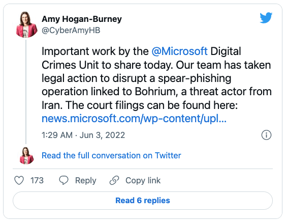2022/06/06 SecurityAffairs — Microsoft の Digital Crimes Unit (DCU) は、イランに拠点を置く APT Bohrium に対して、スピアフィッシング活動を阻止する法的措置を取ったことを発表した。この活動において、米国/中東/インドにある、ハイテク/運輸/行政/教育などの組織を攻撃する際に、脅威アクターが使用したドメインを、Microsoft が押収した。