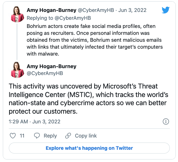 Microsoft は、攻撃に使用された .com/.info/.live/.me/.net/.org/.xyz などのドメインを含む、41件の Web サイトを押収した。この APT グループは、常套手段として、リクルーターを装い、偽のソーシャル・メディア・プロフィールを作成し、それを用いてターゲットを騙し、その個人情報を提供させていた。Bohrium は、それらの情報を窃取すると、フィッシング・メールを被害者に送信していた。そのメールには、クリックすると標的コンピュータで感染プロセスを開始する、リンクが含まれている。