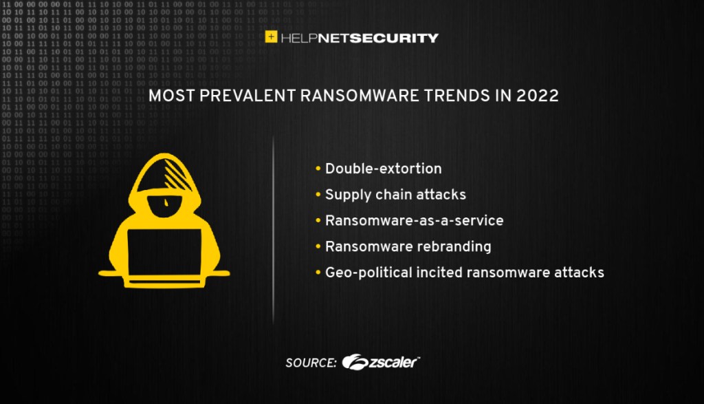 2022年の最も危険なランサムウェアのトレンドは、サプライヤーのビジネスを標的とし、確立された接続/共有ファイル/ネットワーク/ソリューションを悪用して、サプライヤーの顧客に対して第二段階の攻撃を仕掛けるサプライチェーン攻撃である。また ThreatLabz は、脅威アクターのデータリーク・サイトで公開されたデータに基づき、二重脅迫を行うランサムウェアの被害が 120% 近く増加していることを指摘している。
