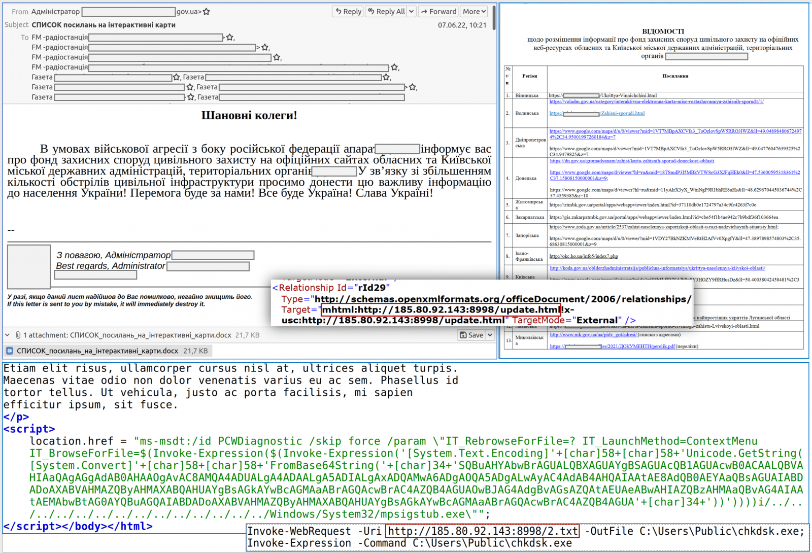 CERT-UAによると、ロシアのハッカーは Follina を介した新たな悪意のメール・キャンペーンを開始し、ラジオ局/新聞社などウクライナのメディアにおける、500人以上の受信者をターゲットにしたとのことだ。このメールには、LIST of links to interactive maps という件名があり、同じ名前の .DOCX 添付ファイルが付いている。そして、このファイルを開くと、JavaScript コードが実行され、CERT-UA が 「悪意の CrescentImp」と分類した、2.txt という名のペイロードが流し込まれる。