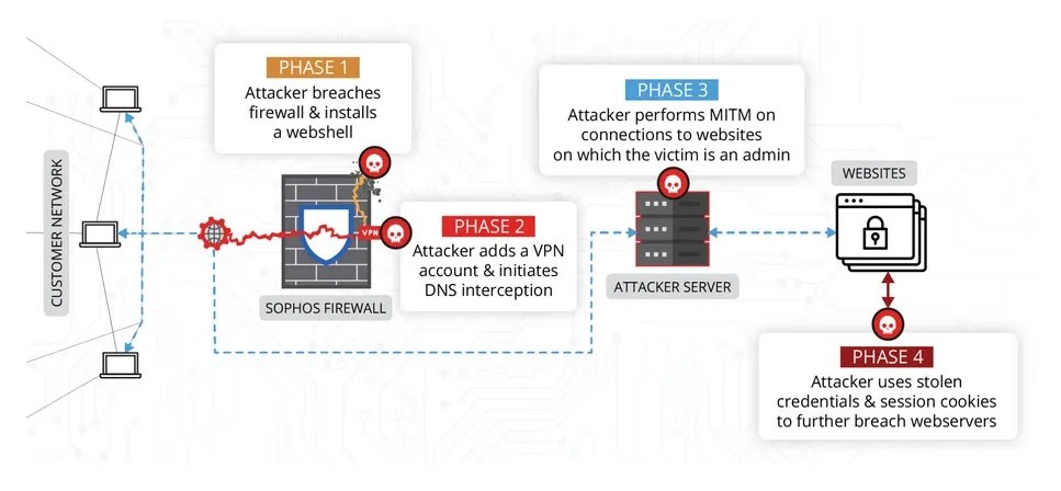 Sophos Firewall の侵害は、一連の攻撃の段階のひとつにすぎない。脅威者は Sophos Firewall に対する侵害の後に、中間者 (MitM) 攻撃で収集したデータを悪用し、この Firewall が存在するネットワークの外側にある、他のシステムも侵害していたのである。