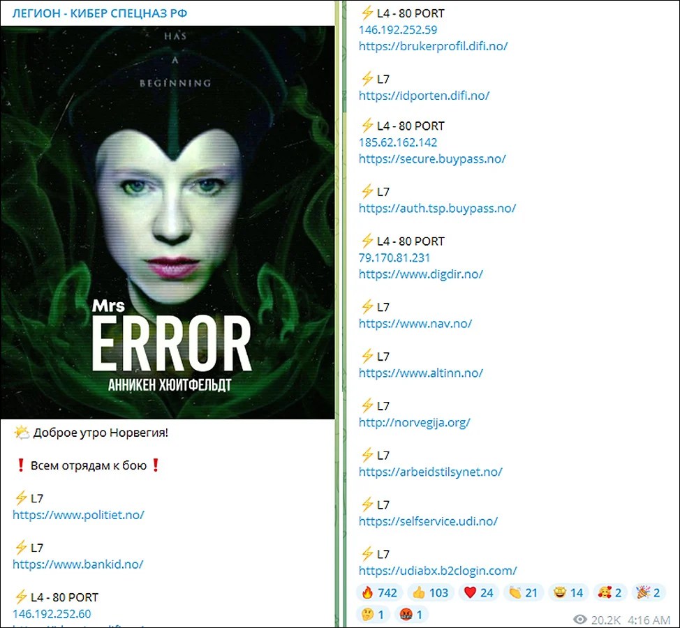 このロシアのハッカー集団によると、標的となったノルウェーの団体には、国家警察/公共サービスポータル/移民オフィスサイト/Altinnデジタル政府文書ポータルなどがあるとされる。