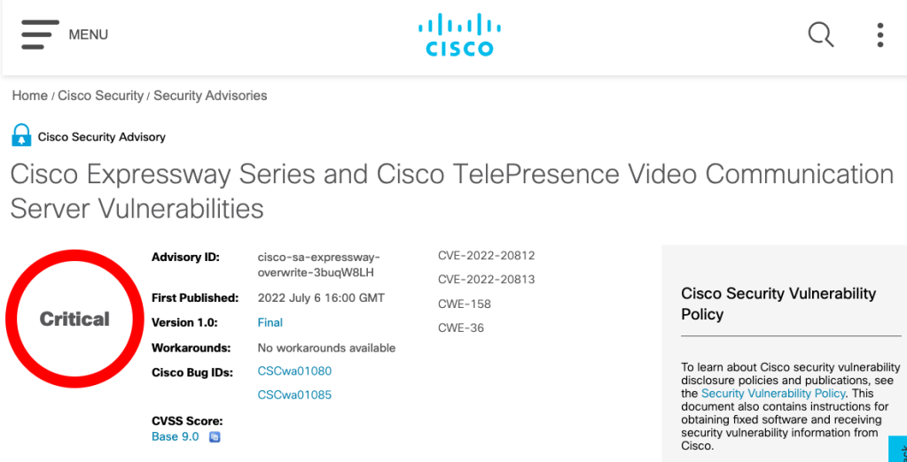 7月6日にも、Cisco の Expressway と Cisco TelePresence Video Communication Server (VCS) に2つの脆弱性が存在するという発表がありました。最近の Cisco に関しては、6月15日の Cisco Secure Email の認証回避の脆弱性 CVE-2022-20798 や、6月17日の Cisco VPN Router のゼロデイ脆弱性 CVE-2022-20825 などがあります。