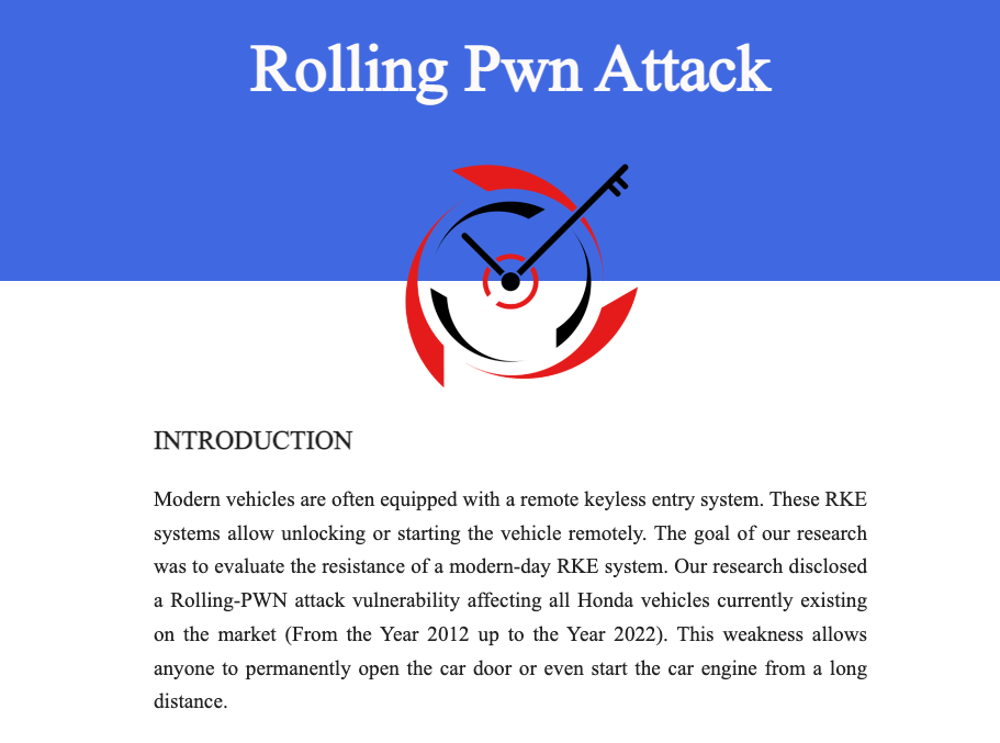 2022/07/10 SecurityAffairs — Star-V Lab のセキュリティ研究者 Kevin2600 と Wesley Li のチームが、脆弱性 CVE-2021-46145 に対する Rolling-PWN 攻撃により、Honda 車両のロック解除や発進を可能になることを発見した。研究者たちが、車両の解錠/発進を遠隔操作で可能にする Remote Keyless Entry System (RKE) をテストしたところ、リモートで車両の解錠/施錠ができる Rolling-PWN 攻撃の問題が発見された。専門家たちによると、この問題は、2012年〜2022年に販売された全ての Honda 車に影響するとのことだ。