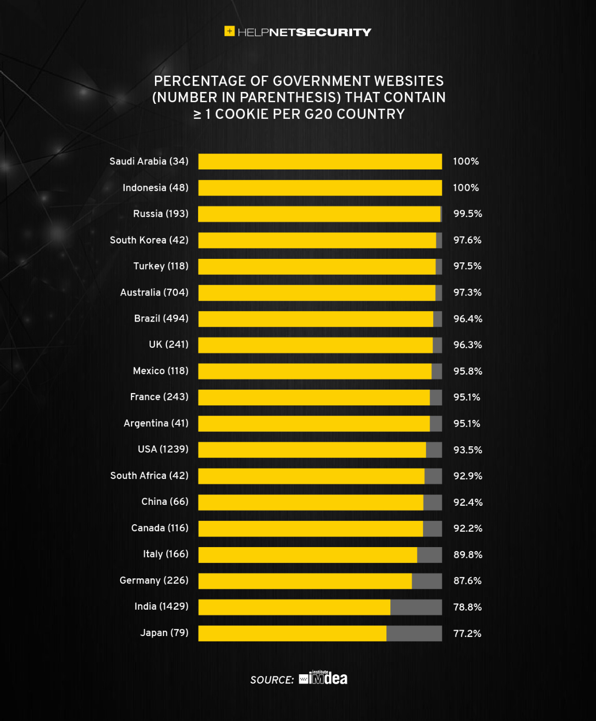 分析された G20 諸国の Web サイトの大半が、ユーザーの同意なしに、少なくとも1つのクッキーをインストールしている。クッキーを導入している Web サイトの割合が、最も低い国は日本の 77.2% だった。その一方で、韓国/サウジアラビア/インドネシアは、ほぼ 100% でランキング上位を占めている。