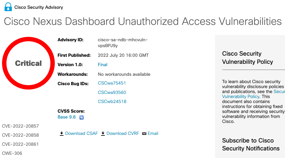 これらの脆弱性は、Cisco Nexus Dashboard 1.1 以降に影響する。今日に公開したセキュリティ・アップデート 2.2(1e) で、Cisco は一連の不具合に対処し、直ちに修正済みのリリースに移行するよう、顧客に推奨している。
