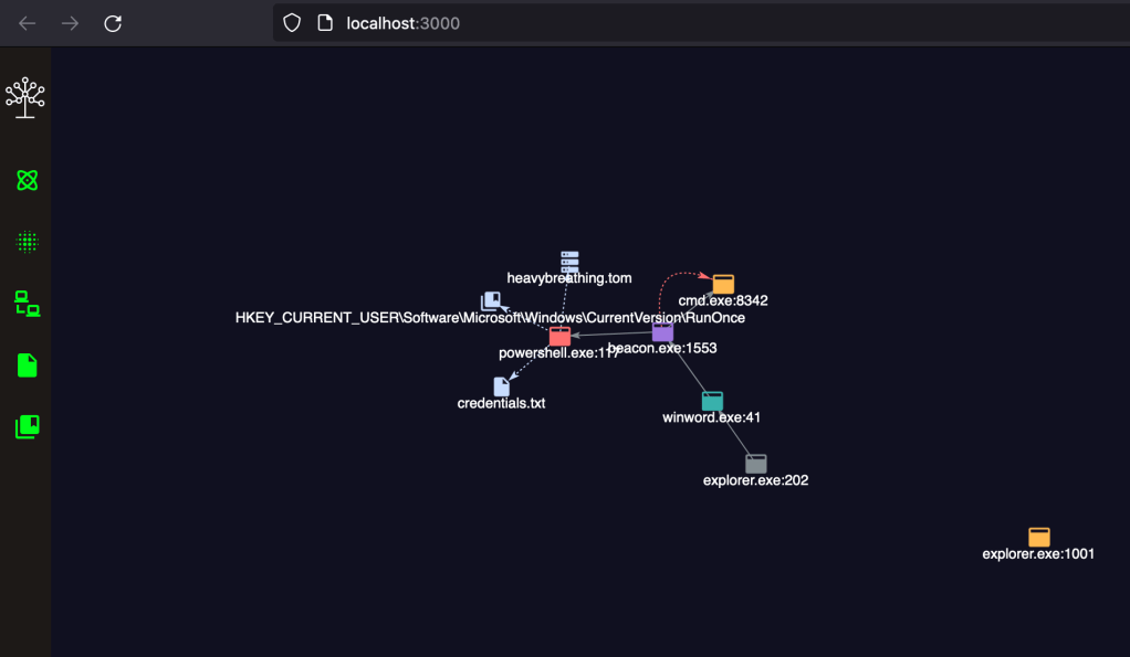 Detectree は、ログデータを構造化し、検出された疑わしいアクティビティと、その検出に関連するプロセス/ネットワーク宛先/ファイル/レジストリキーとの関係などを可視化する。それにより、ブルーチームが調査作業を簡略化できるように設計されている。