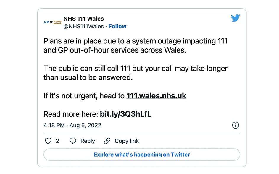今日、Welsh Ambulance Services は、「NHS 111 Wales から、時間外診療の GP プロバイダーに患者を紹介する際に使用される、コンピューター・システムに大規模な障害が発生している。このシステムは、地方医療委員会がサービスを調整する際に使用されるものだ。現在進行中の障害は重大であり、広範囲に及んでおり、英国の4つの国のそれぞれに影響を及ぼしている」と発表した。