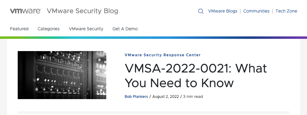 VMware が、かなり焦っているように感じられます。8月2日に「VMware 製品群に影響をおよぼす複数の脆弱性 CVE-2022-31656 などが FIX」という記事をポストしていますので、そちらも、ご参照ください。最近の VMware ですが、5月24日の「VMware の認証バイパスの脆弱性 CVE-2022-22972:PoC エクスプロイトの前にパッチ適用を」や、6月12日の「VMware vCenter Server の脆弱性 CVE-2021-22048:公開から8ヶ月で FIX」のように、深刻な事態に見舞われ続けています。頑張って欲しいですね。