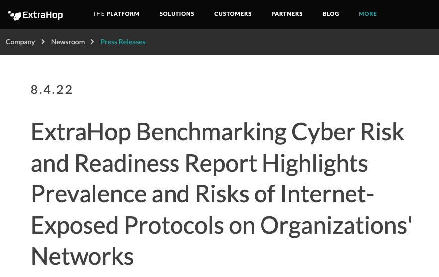 2022/08/10 HelpNetSecurity — ExtraHop Benchmarking Cyber Risk and Readiness レポートでは、SMB/SSH/Telnet などの安全ではないプロトコルや、きわめて機密性の高いプロトコルを、かなりの割合の組織が、インターネットに公開していることが明らかにされていいる。意図的であれ偶発的であれ、こうした公開は、サイバー攻撃者にネットワークへの容易な侵入口を提供し、あらゆる組織の攻撃対象領域を拡大することになる。