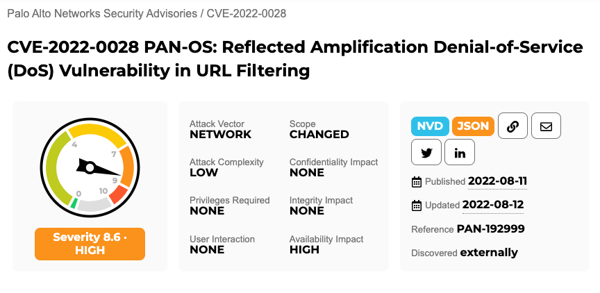 2022/08/12 BleepingComputer — Palo Alto Networks は、同社のネットワーク・ハードウェア製品で使用されている PAN-OS に存在する、深刻度の高い脆弱性を警告するセキュリティ・アドバイザリを発表した。この脆弱性 CVE-2022-0028 (CVSS v3 : 8.6) は、URL フィルタリング・ポリシーの設定ミスにより、未認証のリモート攻撃者による増幅された TCP サービス拒否 (DoS) 攻撃を許すものとなる。