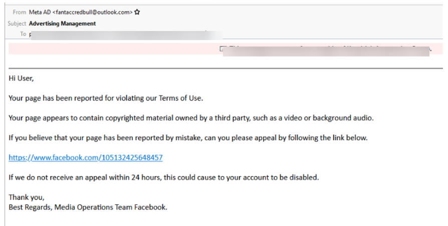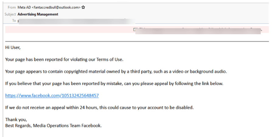 何をみるべきかを知っていれば、多くの矛盾が見つかる。このメールが、Meta や Facebook から送信されたものではないことは明らかだ。具体的には、文法的および文体上の誤りがあり、Outlook ドメインから送信され、Dear User 宛であり、アカウントを無効にするという脅威/切迫感を生み出そうとしている。