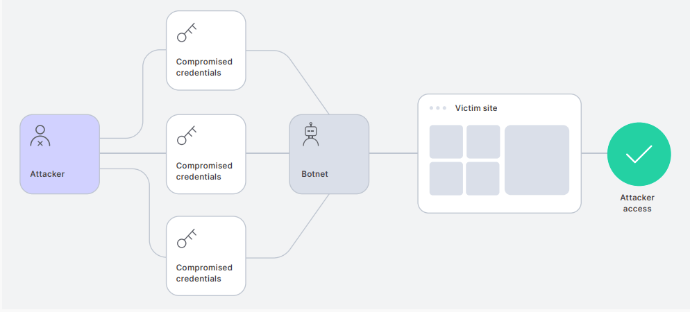 一度、あるサイトから認証情報が漏れたケースや、ブルートフォースでクラックされたケースにおいて、脅威アクターたちは、他のサイトで同じ認証情報を用いてユーザーのアカウントにアクセスしようとする、クレデンシャル・スタッフィング攻撃を実行する。