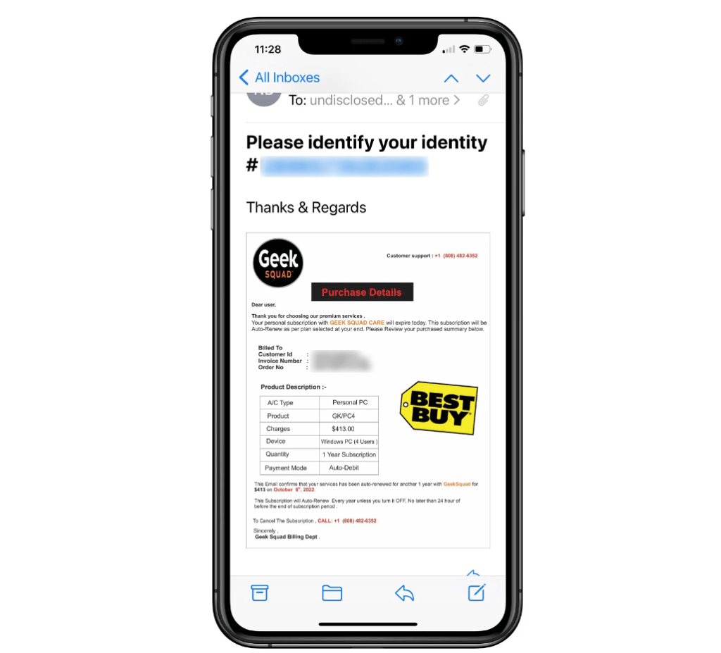指定された番号を介して、被害者が詐欺師に電話をかけると、確認のために請求書の詳細を伝えるように要求される。続いて詐欺師は、システム内に一致する項目がなく、被害者が受け取ったメールはスパムであると述べる。