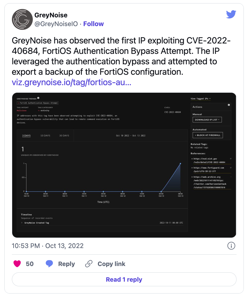 木曜日に、サイバー・セキュリティ企業の GreyNoise も、CVE-2022-40684 を悪用しようとする攻撃者が、野放しになっていることを確認したと発表している。