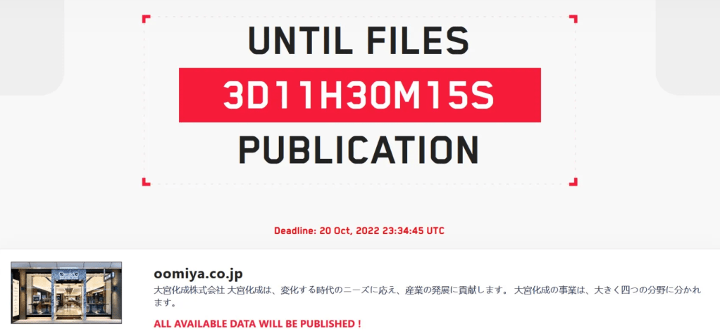 2022/10/17 SecurityAffairs — LockBit 3.0 RaaS を利用するアフィリエイトが、日本のハイテク企業である大宮化成工業にヒットした。同社は、マイクロ・エレクトロニクスと設備システム機器の設計/製造を行う企業である。大宮化成の事業は、化学製品/工業製品の製造/設計および、電子材料の設計、医薬品開発、工場製造の、4つの主要分野に分かれている。