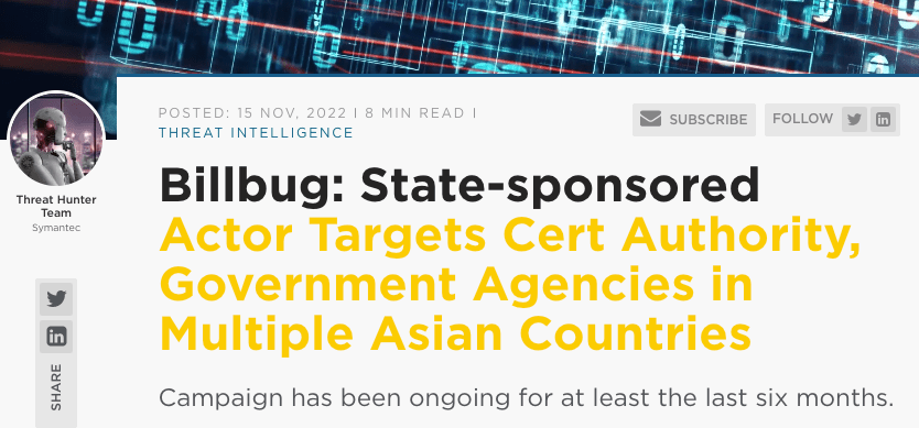 Symantec のセキュリティ研究者たちは、今日のレポートで、「2018年から追跡している Billbug は、認証局企業も標的にしているが、署名付きのマルウェアを展開することで、HTTPS トラフィックの検出や解読をより困難にしている」と述べている。