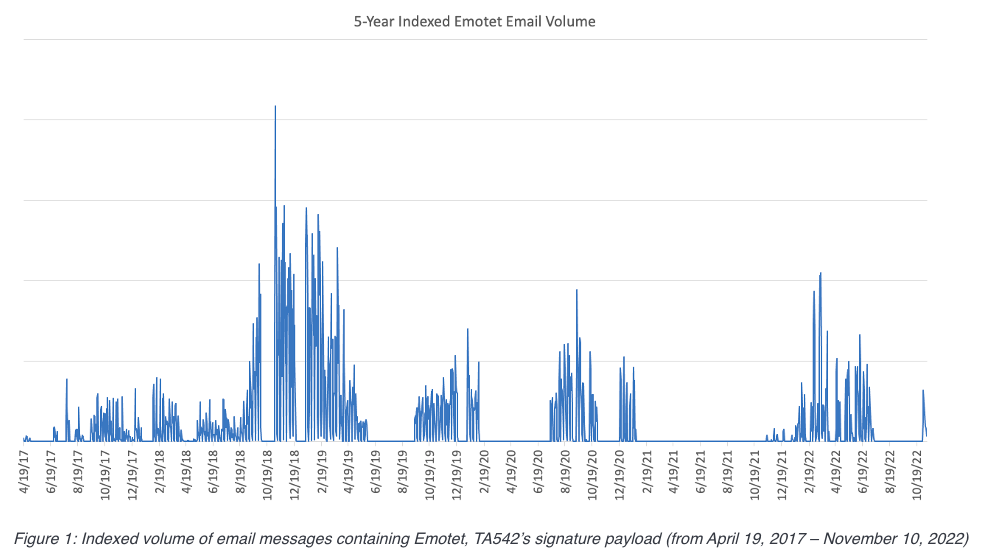 Emotet に関連するアクティビティは、2022年7月に観測されたのが最後であるが、それ後も散発的な感染が報告されている。10月中旬に ESET は、Emotet が新たな攻撃の波を準備している可能性を明らかにし、systeminfo モジュールの更新を指摘している。