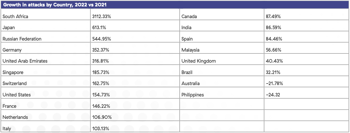 そのため、特定のセクターにおいては、大きな影響が生じている。たとえば、この期間における製造業では、攻撃が 239% も増加し、教育も 132% 増となっているようだ。また、これまでの1年間で、暗号化を伴う攻撃が増加した国別のデータとして、このレポートは 米国 155%/インド 87%/日本 613% を指摘している。