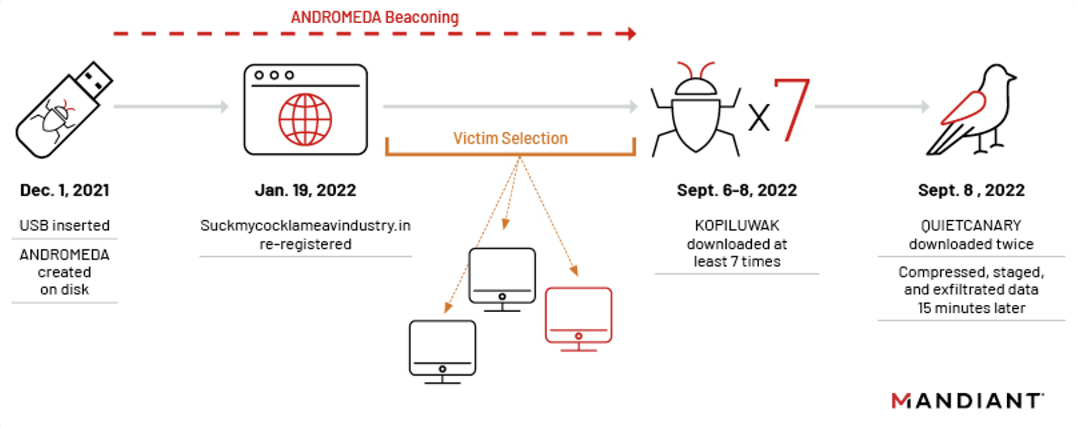 先週のレポートで Mandiant の研究者たちは、「UNC4210 は、少なくとも3種類の期限切れの ANDROMEDA Command-and-Control (C2) ドメインを再登録し、2022年9月には KOPILUWAK/QUIETCANARY を展開するために、標的とする被害者のプロファイリングを開始した」と述べている。
