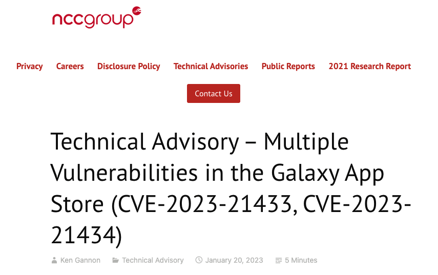 2023/01/23 TheHackerNews — Samsung の Galaxy Store App にセキュリティ欠陥が存在し、ローカル攻撃者による任意のアプリのインストールや、Web 上の不正なランディング・ページへの誘導などが可能なことが判明した。NCC Group が発見した、脆弱性 CVE-2023-21433/CVE-2023-21434 は、2022年11月/12月の時点で Samsung に通知されている。同社は、これらのバグを Medium のリスクとして分類し、2023年1月初めに出荷された、バージョン 4.5.49.8 で対応している。