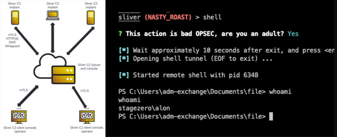 Cybereason の研究者である Loïc Castel と Meroujan Antonyan は、「Silver の C2 インプラントは、第2段階のペイロードとしてローカルで実行され、Sliver C2 サーバからシェル・セッションを取得する。このセッションが、コマンド/スクリプト/バイナリなどを実行するための、複数の方法を提供する」と述べている。
