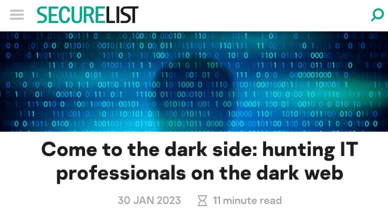 2023/01/30 BleepingComputer — サイバー犯罪グループによるダークウェブでの求人広告は、高額給与/有給休暇/有給病欠などを開発者やハッカーに提示することで、ビジネスとしての運営を支えているようだ。Kaspersky は 2020年3月〜6月の間に、155ヶ所のダークウェブに掲載された 20万件の求人広告を分析し、Hacking/APT グループは主にソフトウェア開発者 (全広告の61%) の採用を目指し、きわめて競争力の高い条件で勧誘しているようだ。