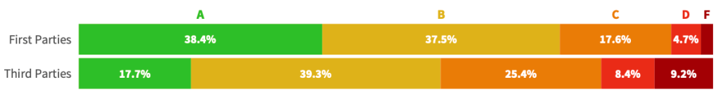 また、このレポートでは、3rd パーティーのセキュリティに関する達成度が、1st パーティーと比べて低いことが示されている。たとえば、SecurityScorecard 評価システムによると、最高のセキュリティ評価である A を、1st パーティー は 3rd パーティーの2倍以上獲得している。それに対して、最低の評価である F に関しては、3rd パーティーが 1st パーティー の5倍近くも獲得している。