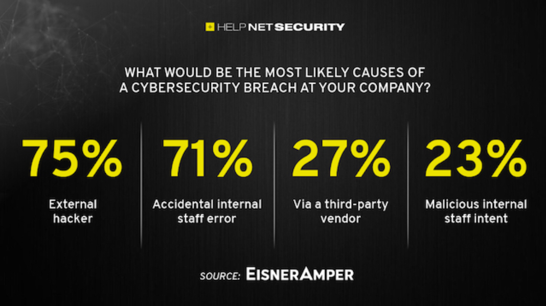 EisnerAmper の Partner and Head of Outsourced IT Services である Rahul Mahna は、「10年前のビジネス・リーダーたちは、サイバー・セキュリティ侵害という減少を、外部のハッカーによる犯行と同一視していたようだ。しかし、バーチャル・ワークやハイブリッド・ワークといった新常識により、サイバー・セキュリティの脅威は多岐にわたるようになり、その多くは内部から発生している」と述べている。