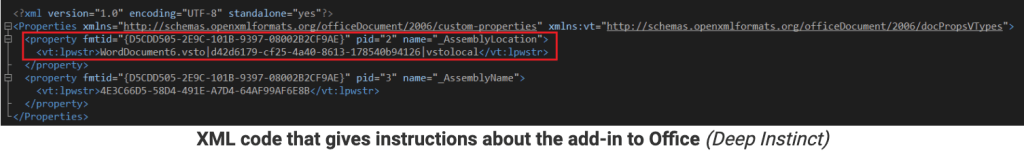 これらのペイロードを運ぶドキュメントには、Office アプリにアドインの場所とインストールの指示を与える、custom.xml パラメータが存在するという特徴が見られる。