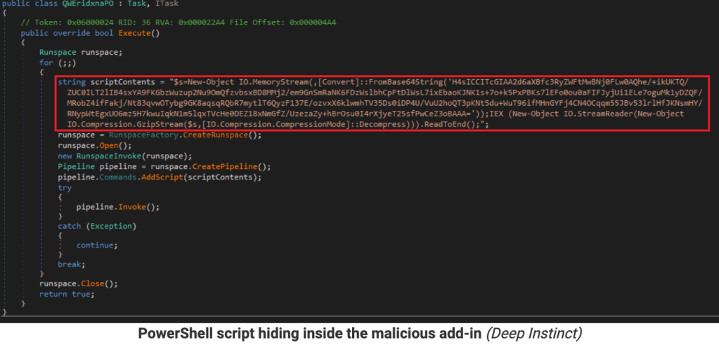 Deep Instinct が発見した、スペインのユーザーを狙った攻撃では、アドインのペイロードはコンピュータ上で、エンコードされ圧縮された PowerShell スクリプトを実行していた。