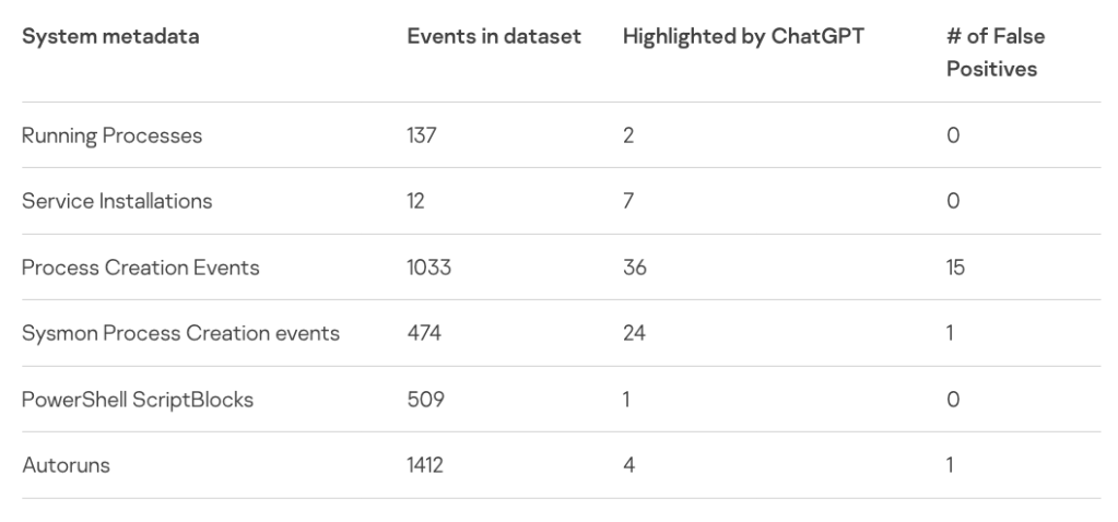 Sergeev は、テスト・システムの 3,500以上のイベントのメタデータを ChatGPT で分析し、74 の潜在的な侵害の指標を見つけたが、そのうちの 17 は誤検出だった。この実験から、Endpoint Detection and Response (EDR) システムを実行していない企業における、フォレンジック情報の収集/難読化されたコードの検出/バイナリコードのリバースエンジニアリングなどで、ChatGPT が有効であることが示唆された。