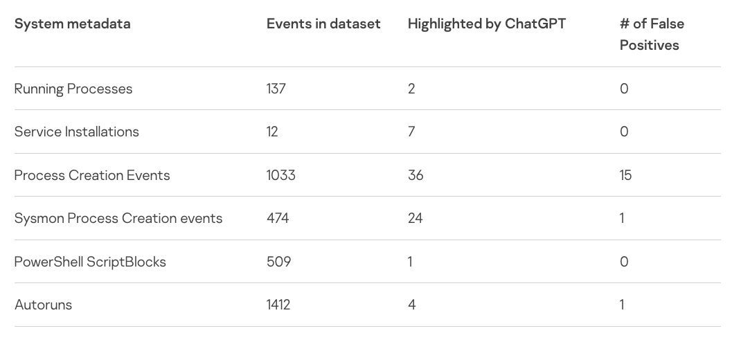 Sergeev は、テスト・システムの 3,500以上のイベントのメタデータを ChatGPT で分析し、74 の潜在的な侵害の指標を見つけたが、そのうちの 17 は誤検出だった。この実験から、Endpoint Detection and Response (EDR) システムを実行していない企業における、フォレンジック情報の収集/難読化されたコードの検出/バイナリコードのリバースエンジニアリングなどで、ChatGPT が有効であることが示唆された。