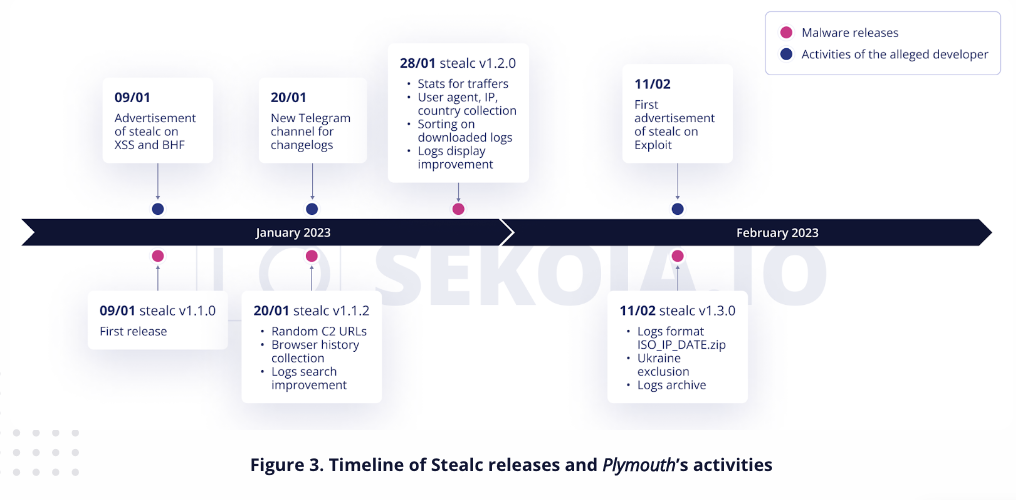 Stealc は、ロシア語圏のアンダー・グラウンド・フォーラムである XSS と BHF で、Plymouth という脅威アクターにより、2023年1月9日から販売されている。同マルウェアは C 言語で書かれており、Web ブラウザ/暗号ウォレット/メール・クライアント/メッセージング・アプリなどからデータを盗み出す機能を備えている。