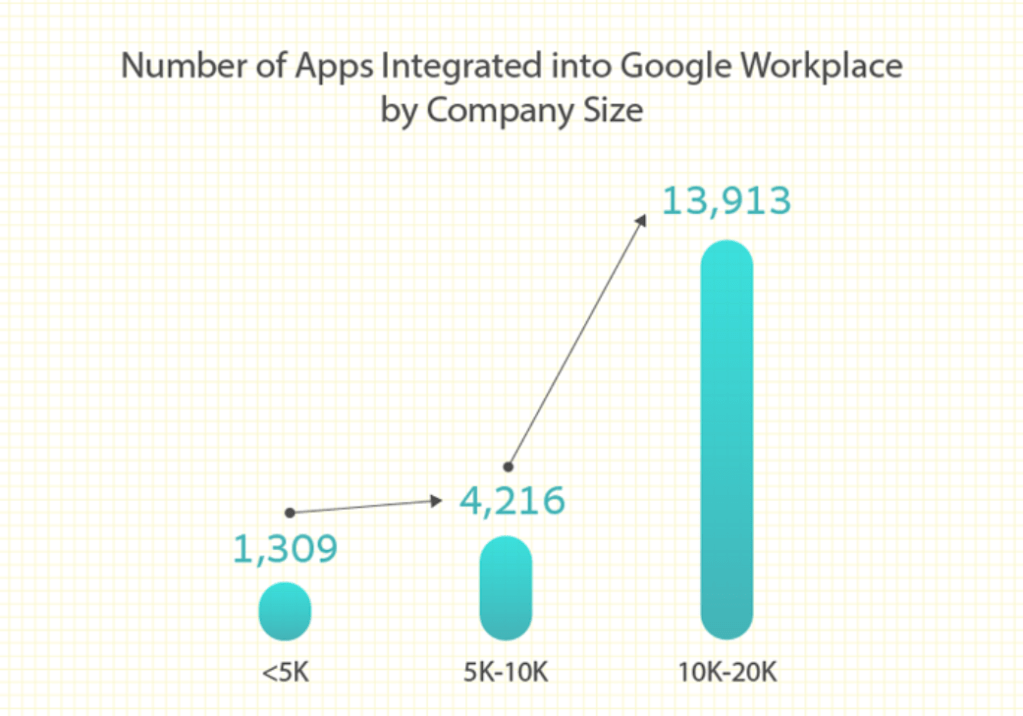 小規模な企業も例外ではありません。M365 を使用している企業は、1人のユーザーあたり平均で 0.2本のアプリが使用されているのに対して、Google Workspace を使用している企業では、平均で 0.6本のアプリケーションが使用されているとのことだ。